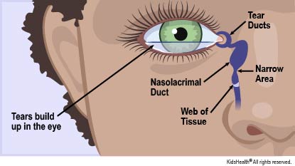 A tear duct is a small tube that drains tears from the eyes. Tears are made in glands under the eyelids. They wash over the eyes to keep them moist and clean. Then, they drain though the tear ducts. When a tear duct is blocked (a blockage), the tears can't drain.