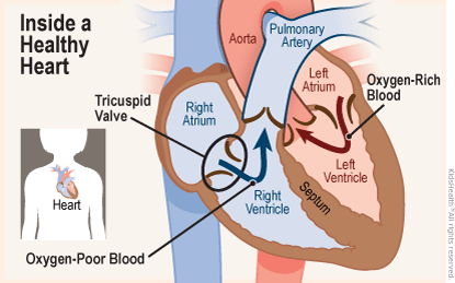In a normal heart, the tricuspid valve lets blood flow from the right atrium into the right ventricle. When the right ventricle squeezes to pump blood to the lungs, the tricuspid valve closes. This keeps blood from flowing back into the right atrium.
