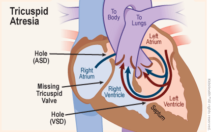 Tricuspid atresia is a congenital heart defect (this means that a baby who has it is born with it). It happens when the heart's tricuspid valve does not develop. As a result, blood can't flow from the heart's right atrium (upper receiving chamber) to the right ventricle (lower pumping chamber) as it should.