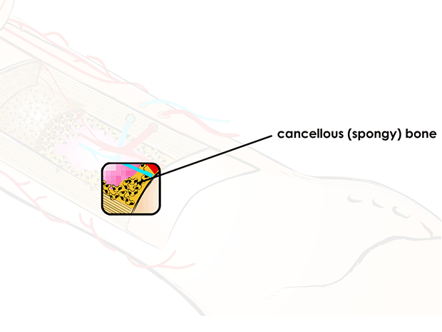 - Cancellous (pronounced: KAN-suh-lus) bone, which looks like a sponge, is inside compact bone. It is made up of a mesh-like network of tiny pieces of bone called trabeculae (pronounced: truh-BEH-kyoo-lee). This is where bone marrow is found.