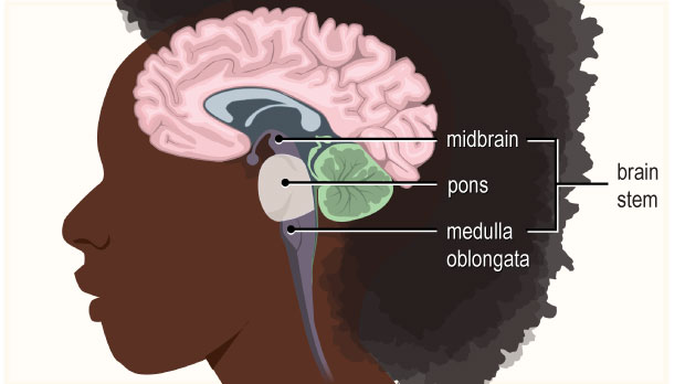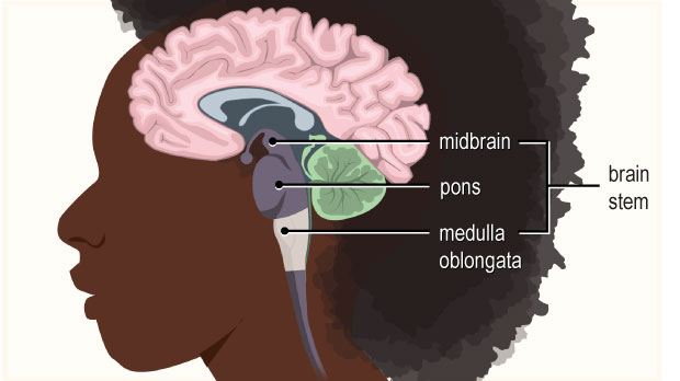 The pons and the medulla, along with the midbrain, are often called the brainstem. The brainstem takes in, sends out, and coordinates the brain's messages. It also controls many of the body's automatic functions, like breathing, heart rate, blood pressure, swallowing, digestion, and blinking.