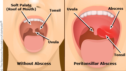 A peritonsillar abscess is an area of pus-filled tissue at the back of the mouth, next to one of the tonsils. The abscess can be very painful and can make it hard to open the mouth.