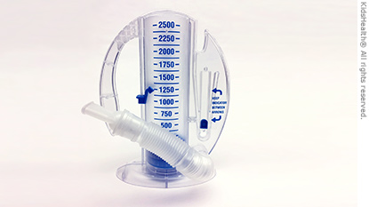 An incentive spirometer is a hand-held device that helps people to take slow, deep breaths. It's like exercise equipment for the lungs to keep them strong and working well.