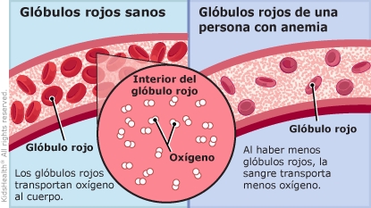 La anemia ocurre cuando la cantidad glóbulos rojos en el cuerpo de una persona es demasiado baja. Los glóbulos rojos contienen hemoglobina, una proteína que transporta oxígeno por todo el cuerpo. Sin suficiente cantidad de glóbulos rojos, el oxígeno no puede llegar adecuadamente a los órganos del cuerpo. Y sin suficiente oxígeno, los órganos no pueden funcionar con normalidad.