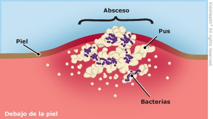 Los abscesos se forman cuando las bacterias, los hongos u otros gérmenes entran en una herida (como un corte) y causan una infección. Cuando ocurre esto, el sistema inmunitario envía los glóbulos blancos para combatir la infección. Los glóbulos blancos se acumulan dentro de la herida y fabrican pus. Cuando se acumula pus dentro de una herida, a veces le cuesta salir al exterior. Esto puede hacer que duela la zona.