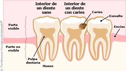 La caries ocurre cuando las bacterias (gérmenes) y los alimentos que quedan en los dientes después de comer no se eliminan con el cepillado de los dientes o el uso de hilo dental. Las bacterias producen un ácido que debilita la superficie exterior dura del diente (llamada "esmalte"). Una vez que sucede esto, el ácido puede causar una erosión más profunda en el diente. Si esto ocurre, la caries puede causar dolor o sensibilidad en el diente.