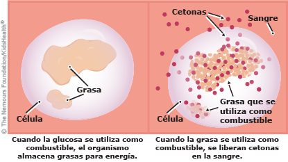 La glucosa (un tipo de azúcar) es la principal fuente de energía del organismo. Pero cuando el cuerpo no puede usar glucosa como combustible (por ejemplo, cuando una persona no tiene la diabetes bajo control), descompone la grasa para obtener energía.