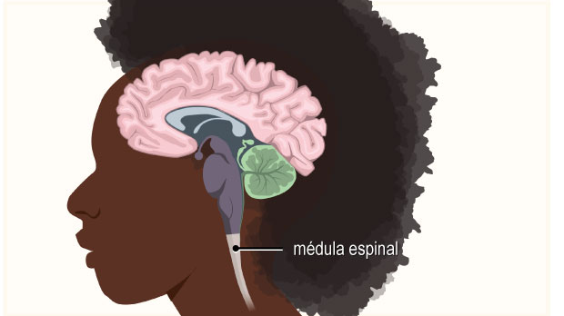 La médula espinal es un conjunto extenso de tejido nervioso. En los adultos, mide aproximadamente 18 pulgadas de largo y 1/2 pulgada de espesor. Se extiende desde la parte inferior del tronco encefálico y a lo largo de la espalda.