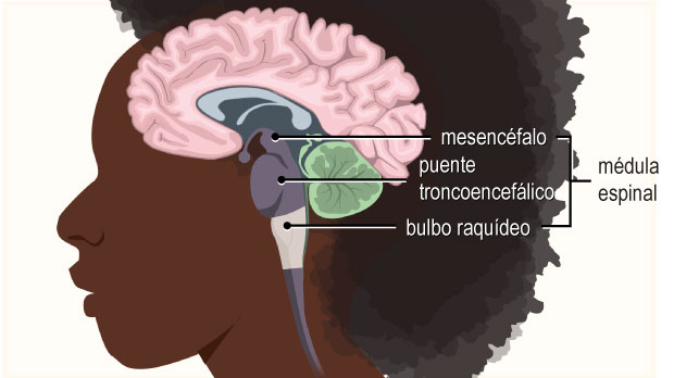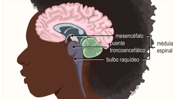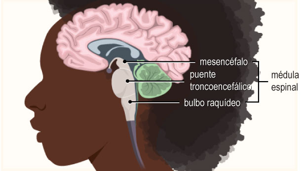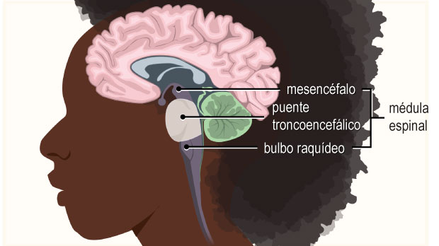 El tronco encefálico conecta el encéfalo con la médula espinal. Está formado por el puente troncoencefálico, la médula y el mesencéfalo. Estas partes funcionan al unísono para controlar y coordinar los mensajes que llegan al encéfalo y salen de él. El tronco encefálico controla, además, muchas funciones del cuerpo en las que casi nunca pensamos, como la respiración, la frecuencia cardíaca, la tensión arterial, la deglución (tragar) y la digestión.