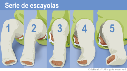 Escayolado. La primera escayola se coloca una o dos semanas después de que nazca el bebé. Luego, el bebé vuelve a la consulta del traumatólogo una vez por semana para que le mueva y le estire el pie con suavidad y le sustituya la escayola vieja por una escayola nueva. La nueva escayola girará el pie un poco más que la escayola anterior hacia la dirección correcta. La mayoría de los bebés llevan una serie de cinco a siete escayolas a lo largo de unas pocas semanas o meses.