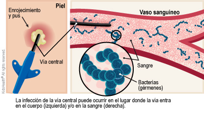 La mayoría de las veces, las vías centrales no causan ningún problema. Si surgen problemas, estos se suelen deber a que la vía central se infecta y/o deja de funcionar. En contadas ocasiones, las vías centrales pueden causar coágulos de sangre. Los profesionales del cuidado de la salud revisan los riesgos con las familias antes de colocar una vía central.