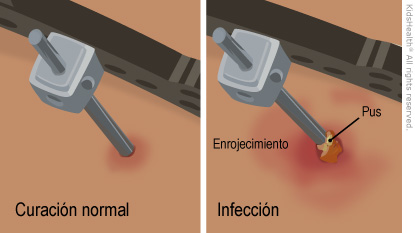 Enrojecimiento, dolor, calor, hinchazón o una secreción abundante en cualquier lugar de inserción de las varillas pueden ser signos de que su hijo sufre una infección en el área de las varillas. Una fiebre superior a 100,4 ºF (38 °C) también puede ser un signo de infección.