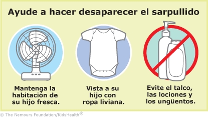 Si el sarpullido de su hijo le pica mucho, manténgale las uñas bien cortas para evitar que se rasque, lo que le podría desgarrar la piel y causar infecciones. Anímelo a darse palmaditas o golpecitos sobre la erupción para aliviarse el picor. Si su hijo es mayor de 2 años, puede ponerle loción de calamina sobre la piel afectada (pero no en la cara ni en los genitales) 3-4 veces al día para aliviarle las molestias y el picor.