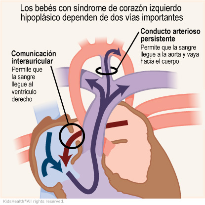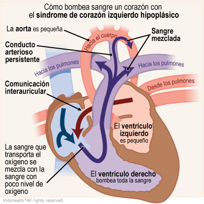 El ventrículo derecho, que solo debería bombear sangre hacia los pulmones, bombea sangre hacia los pulmones y también hacia el resto del cuerpo a través de una conexión llamada "conducto arterioso persistente". Normalmente, los bebés no necesitan esta conexión, que se cierra al nacer. Pero un bebé con síndrome de corazón izquierdo hipoplásico necesita esta conexión para que la sangre pueda llegar al resto del cuerpo. Debido a que el ventrículo derecho está bombeando sangre a los pulmones y al resto cuerpo, hay una sobrecarga de trabajo.