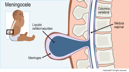 - Mielomeningocele: sucede cuando un saco (pequeña bolsa o quiste) que contiene las meninges, el líquido cefalorraquídeo y parte de la médula espinal sobresale a través de un defecto (hueco) de la columna vertebral y la piel. Es posible verlo en la espalda del bebé.