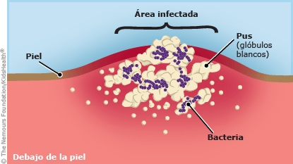 - Su hijo tiene un área de la piel de color rojo, hinchada, que le duele y/o que está llena de pus, sobre todo si él se encuentra mal o tiene fiebre.
