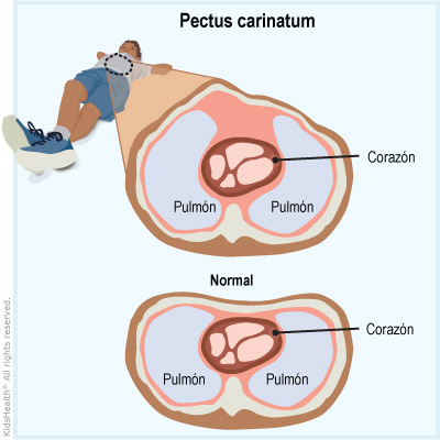 El pectus carinatum es un problema de la pared torácica donde la parte delantera del pecho se proyecta hacia afuera más de lo que debiera. Esto sucede cuando las costillas y el hueso central del pecho (esternón) sobresalen más de lo normal.