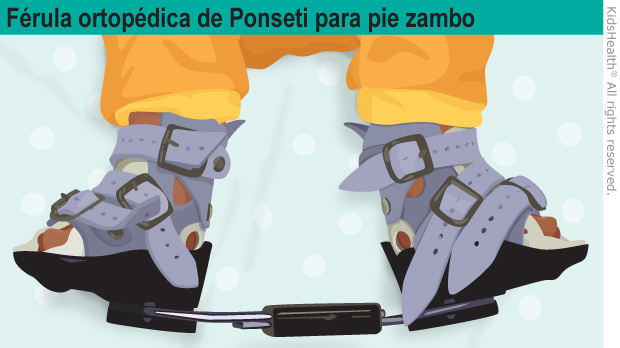 Una férula ortopédica para pie zambo (a menudo llamada "órtesis") consta de dos partes: una barra (generalmente de metal) y unas botas o zapatos especiales que se unen a cada extremo de la barra. La barra tiene la misma longitud que la distancia que hay entre los hombros del bebé. Se une a las bases de las botas deslizando la férula por las ranuras de las botas y haciendo clic.
