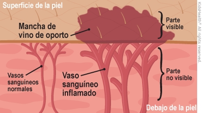 Por ejemplo, los médicos controlan las manchas de vino Oporto ubicadas cerca de los ojos o en la frente. Esto se debe a que es posible que estén asociadas a un trastorno neurológico poco frecuente llamado síndrome de Sturge-Weber, que causa problemas como convulsiones, retrasos del desarrollo y trastornos del aprendizaje. Las manchas sobre los párpados también pueden derivar en glaucoma (mayor presión dentro del ojo, que puede afectar la vista y provocar ceguera si no recibe tratamiento).