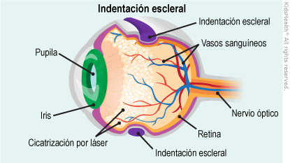 - indentación escleral: supone colocar una banda flexible, generalmente de silicona, alrededor de todo el ojo. La banda rodea la esclerótica, o el blanco del ojo, haciendo que se pliegue hacia dentro o que se doble. Esto, a su vez, empuja la retina desprendida para aproximarla a la pared externa del ojo.