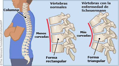Los pequeños huesos que componen la columna vertebral (llamados "vértebras") suelen ser rectangulares. Se apilan como los ladrillos y están separados por un cartílago flexible. Cuando un niño tiene la enfermedad de Scheuermann, la parte delantera de algunas vértebras de la espalda superior crece más despacio que la parte posterior. Estas vértebras adquieren forma de cuña, de modo que, cuando se apilan entre sí, la columna vertebral se encorva, lo que hace que la espalda se vea redondeada o jorobada.