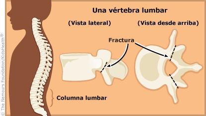 La columna vertebral cuenta con 33 huesecitos llamados vértebras. Nueve vértebras están fusionadas entre sí para formar el coxis y las otras 24 vértebras se encuentran en la espalda. Las vértebras lumbares se encuentran en la parte inferior de la espalda (próximas al coxis) y es en estas vértebras donde se suele dar la espondilolisis.