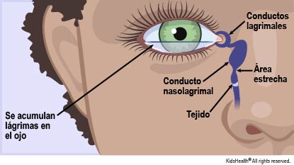 Un conducto lagrimal es un tubito que drena las lágrimas de los ojos a la nariz. Las lágrimas se fabrican dentro de unas glándulas que tenemos debajo de los párpados. Las lágrimas se encargan de lavar los ojos para mantenerlos húmedos y limpios. Luego, salen de los ojos a través de los conductos lagrimales. Cuando un conducto lagrimal está obstruido (y no drena bien), las lágrimas se acumulan en la superficie del ojo y el ojo lagrimea.