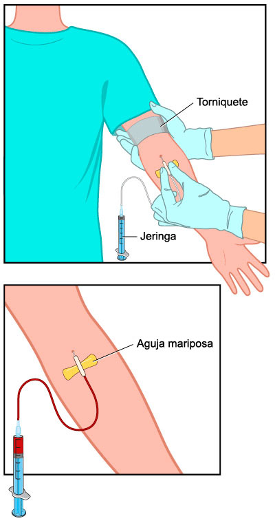 En general, un profesional extraerá sangre de una vena. En el caso de lactantes, es posible obtener la sangre con una pequeña punción en el talón con una pequeña aguja (lanceta). Si la extracción de sangre se realiza en una vena, se limpia la superficie de la piel con un antiséptico y se coloca una banda elástica (torniquete) alrededor del brazo para ejercer presión y lograr que las venas se hinchen con sangre. A continuación, se inserta una aguja en la vena (por lo general, se hace a la altura del codo en la parte interna del brazo, o en el dorso de la mano) y se extrae sangre que se recoge en un vial o una jeringa.