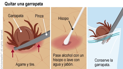 La mayoría de las picaduras de garrapata son inofensivas y no requieren tratamiento médico. Pero algunas garrapatas (como la garrapata del ciervo, la del bosque y otras) pueden ser portadoras de gérmenes nocivos que causan enfermedades, como la rickettsiosis maculosa (o “rickettsiosis exantemática”), también conocida como “fiebre maculosa de las montañas Rocosas", y la enfermedad de Lyme. La garrapata del ciervo es minúscula, no más grande que la punta de un lápiz. Hay otras garrapatas que son de mayor tamaño y más fáciles de detectar en la piel.
