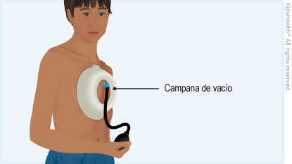 Una campana de vacío es un dispositivo de goma en forma de campana o de copa que se conecta a una bomba. El dispositivo se coloca sobre la parte delantera del pecho del niño y se usa la bomba para succionar aire hacia el exterior del dispositivo. Esto crea una succión, o vacío, que tira o arrastra el pecho y el esternón hacia adelante. Con el paso del tiempo, la pared torácica y el esternón permanecen orientados hacia adelante por sí solos y mantienen la nueva forma que han adquirido.