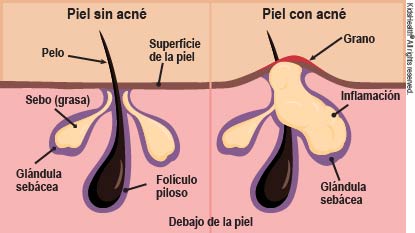 Los folículos pilosos de la piel (o poros) contienen glándulas sebáceas. Estas glándulas fabrican sebo, que es la grasa que lubrica el pelo y la piel. La mayor parte del tiempo, las glándulas sebáceas fabrican la cantidad adecuada de sebo. Pero a medida que el cuerpo madura y se desarrolla, las hormonas estimulan a las glándulas sebáceas para que fabriquen más sebo.