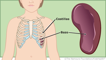 El bazo se encuentra en la parte superior izquierda del abdomen, debajo de la caja torácica. Ayuda a proteger al cuerpo, eliminando del torrente sanguíneo los glóbulos rojos viejos y otras sustancias extrañas (como los gérmenes).