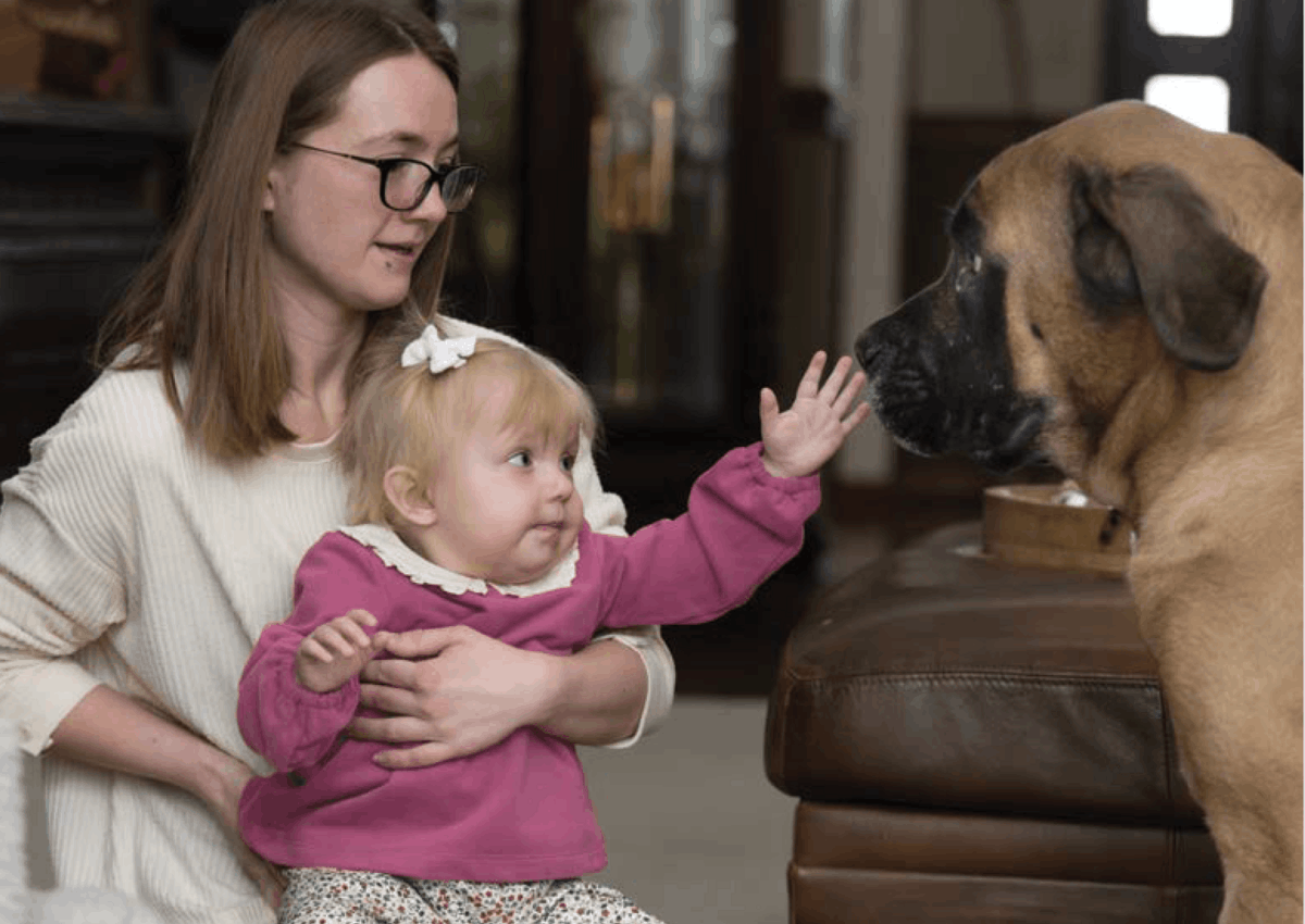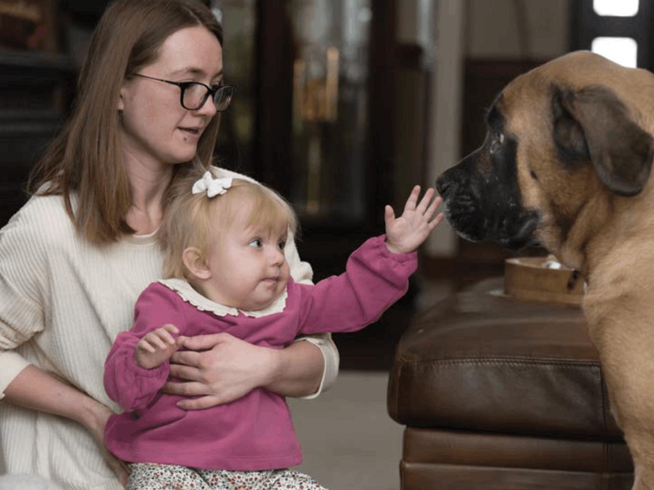 Dominica holds Penelope while she pets her dog, Bjorn.