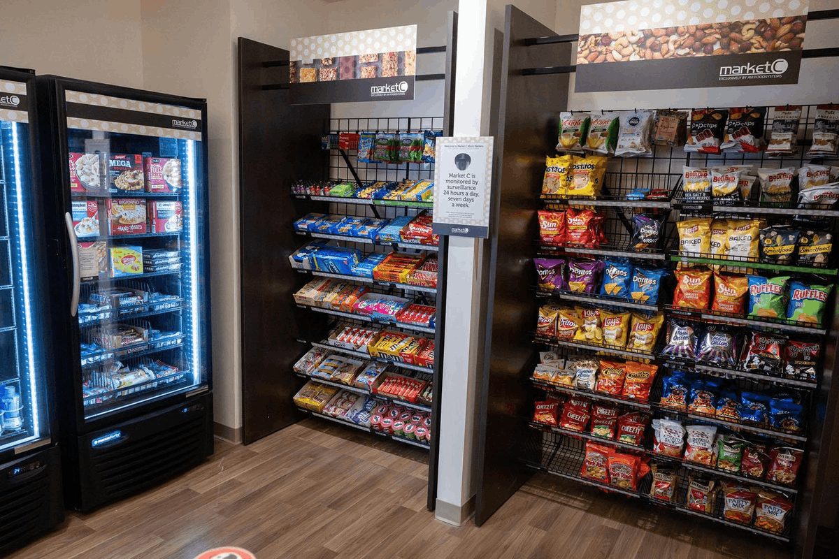 A vending area near the cafeteria is open 24 hours a day. The vending area has both hot and cold foods, and a dollar bill changer.