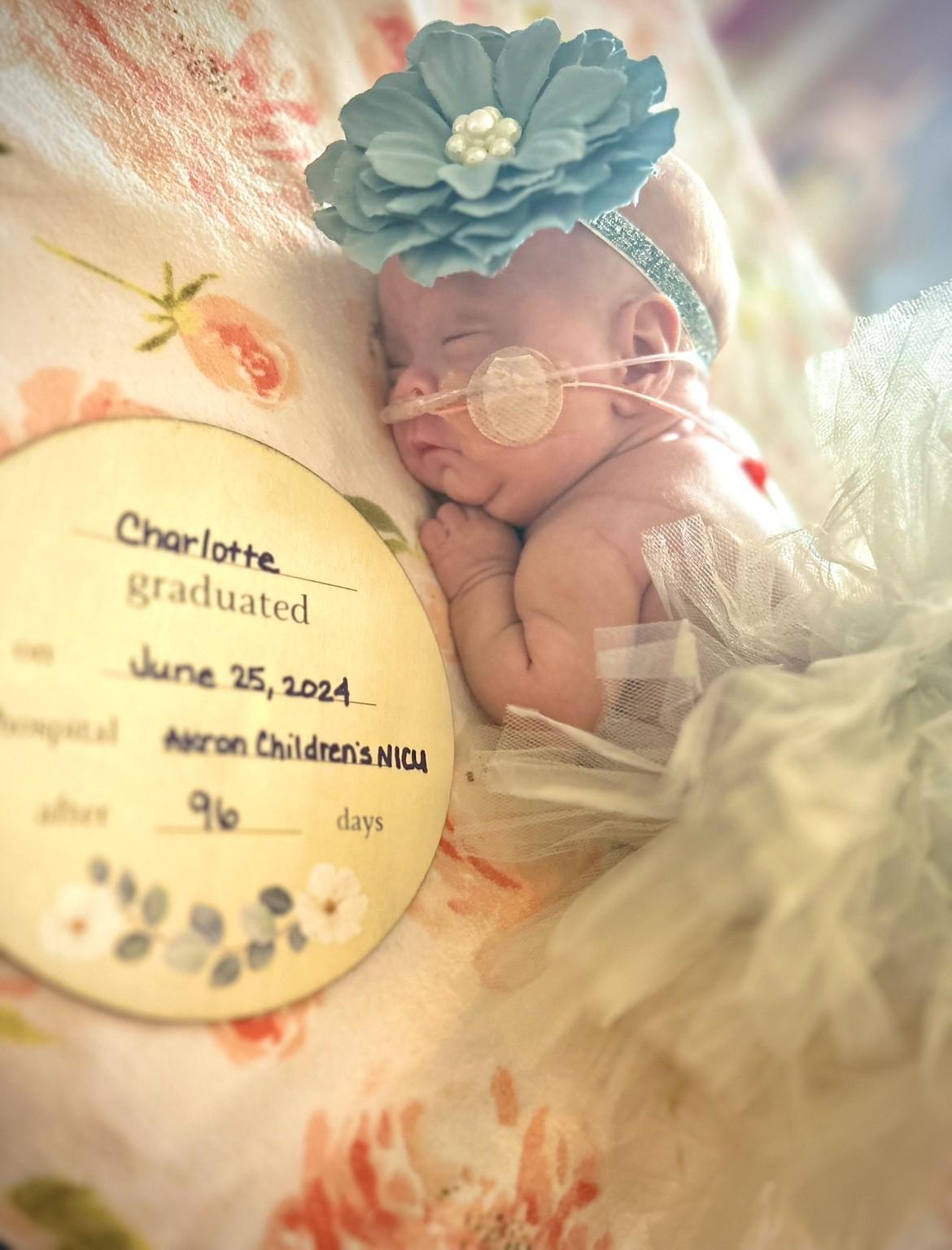 Charlotte was born at 28 weeks 1 day weighing 1 lb 2 oz due to preterm labor and severe inter-uterine growth restriction (IUGR). After 3 attempts, Charlotte was intubated and transferred to Akron Children's Main campus NICU. Charlotte was intubated for one week and spent 96 days in the NICU primarily struggling with growth and weaning oxygen. She was diagnosed with chronic lung disease (bronchopulmonary dysplasia) as well as feeding difficulties. Charlotte was a fighter and despite her small size, she was labeled as small but mighty. She proved everyone wrong whenever someone doubted her abilities especially when trying to wean oxygen.